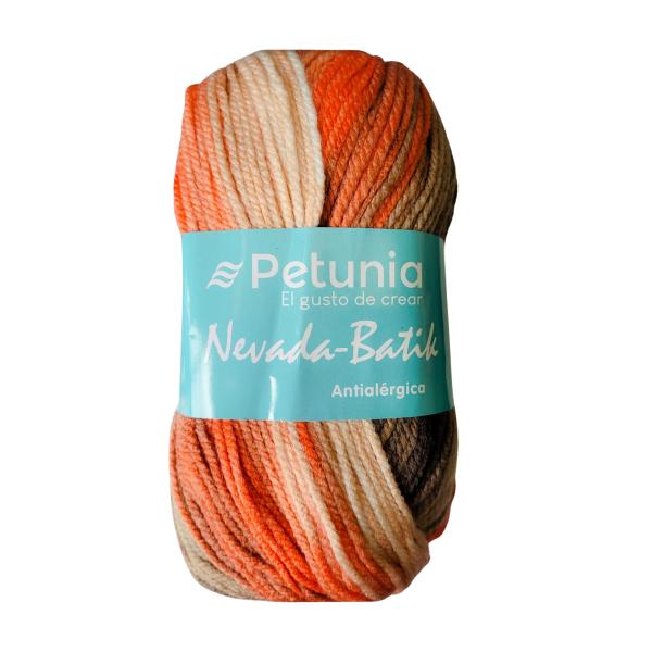 Nevada Batik de Lanas Petunia es un hilado acrílico premium de origen turco, ideal para invierno por su suavidad y calidez. Se caracteriza por su teñido batik (matizado) que crea patrones de colores automáticamente. Es de grosor medio-grueso, presentado en ovillos de 100 gramos con aproximadamente 185 metros, siendo perfecto para mantas y prendas abrigadoras.